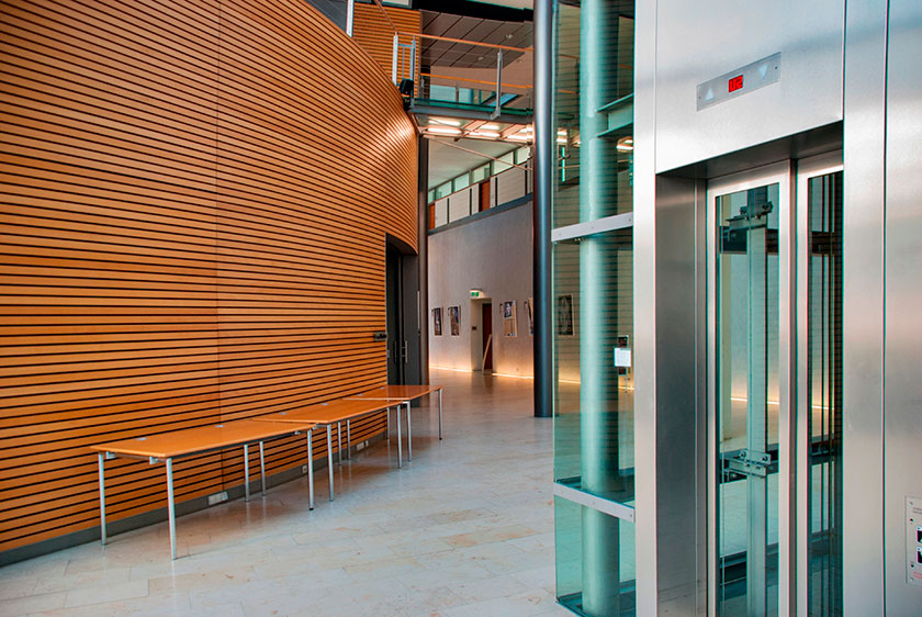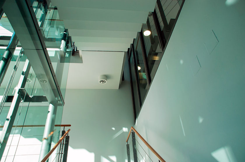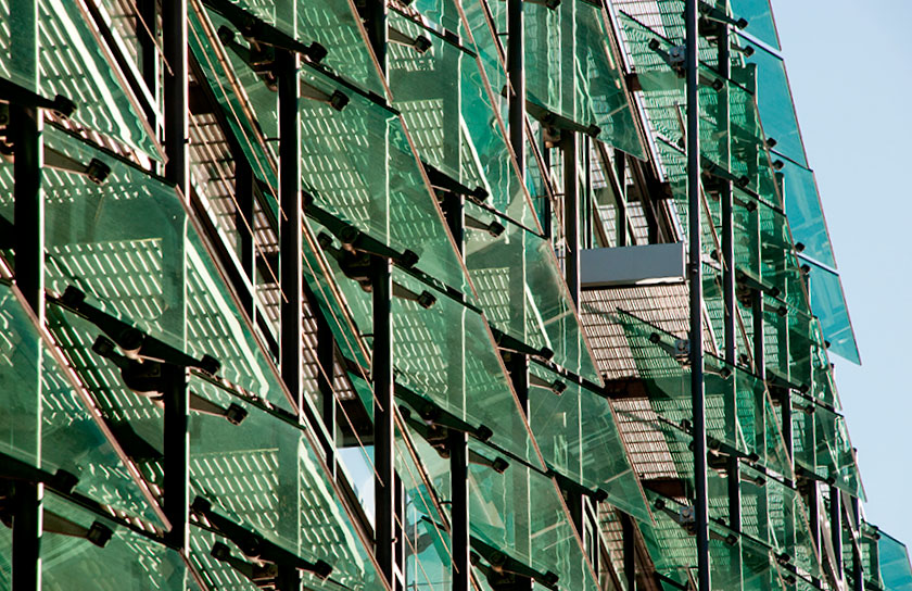 Niedrigenergie Gebäude mit Gebäudehülle mit sehr gutem U-Wert und Sonnenschutz mittels Glaslamellen.