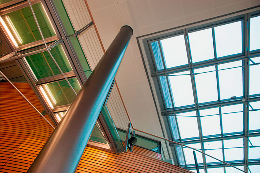Drei durchgehende vertikale Öffnungen werden als Türme über das Dach so erhöht,daß durch Absorption der eingestrahlten Sonne ein thermischer Auftrieb entsteht, der die sommerliche Nachtlüftung verstärkt.