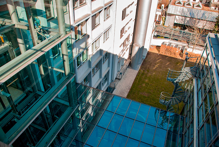 Dächer mit extensiver Begrünung. Das Regenwasser wird in eine unterirdische Zisterne geleitet und nach Filterung zur WC-Spülung verwendet.